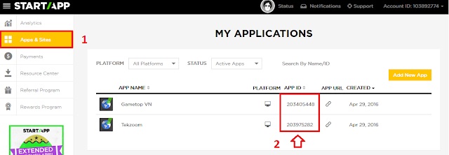 Chú ý : App ID và DEVID các bạn lấy trên trang tài khoản startapp của các bạn