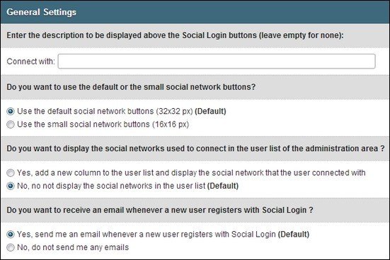 Phần này cho phép bạn tùy chỉnh dòng mô tả cho tính năng đăng nhập bằng mạng xã hội, lựa chọn style của các biểu tượng mạng xã hội, gửi email thông báo cho người dùng đăng ký mới và hiển thị các thông tin đăng nhập mạng xã hội mà người dùng đã kết nối.