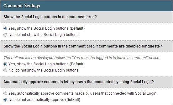 Phần này cho phép bạn thiết lập việc có hiển thị tính năng social login vào khung bình luận hay không. Các cài đặt bổ sung như các nút kích hoạt/ vô hiệu hóa cho khách truy cập và phê duyệt bình luận tự động sẽ được tìm thấy ở đây.
